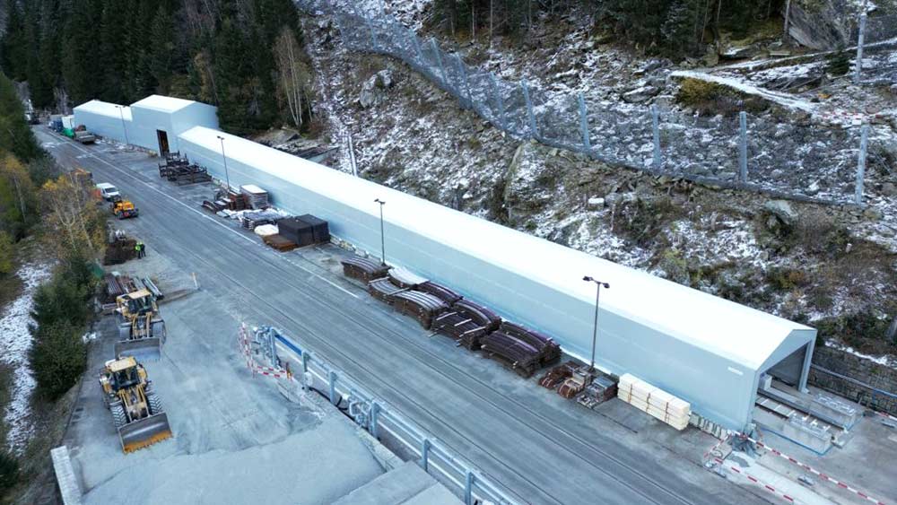 Lagerzelthallen für die Produktion von Betonteilen des Tunnels in den Schweizer Alpen